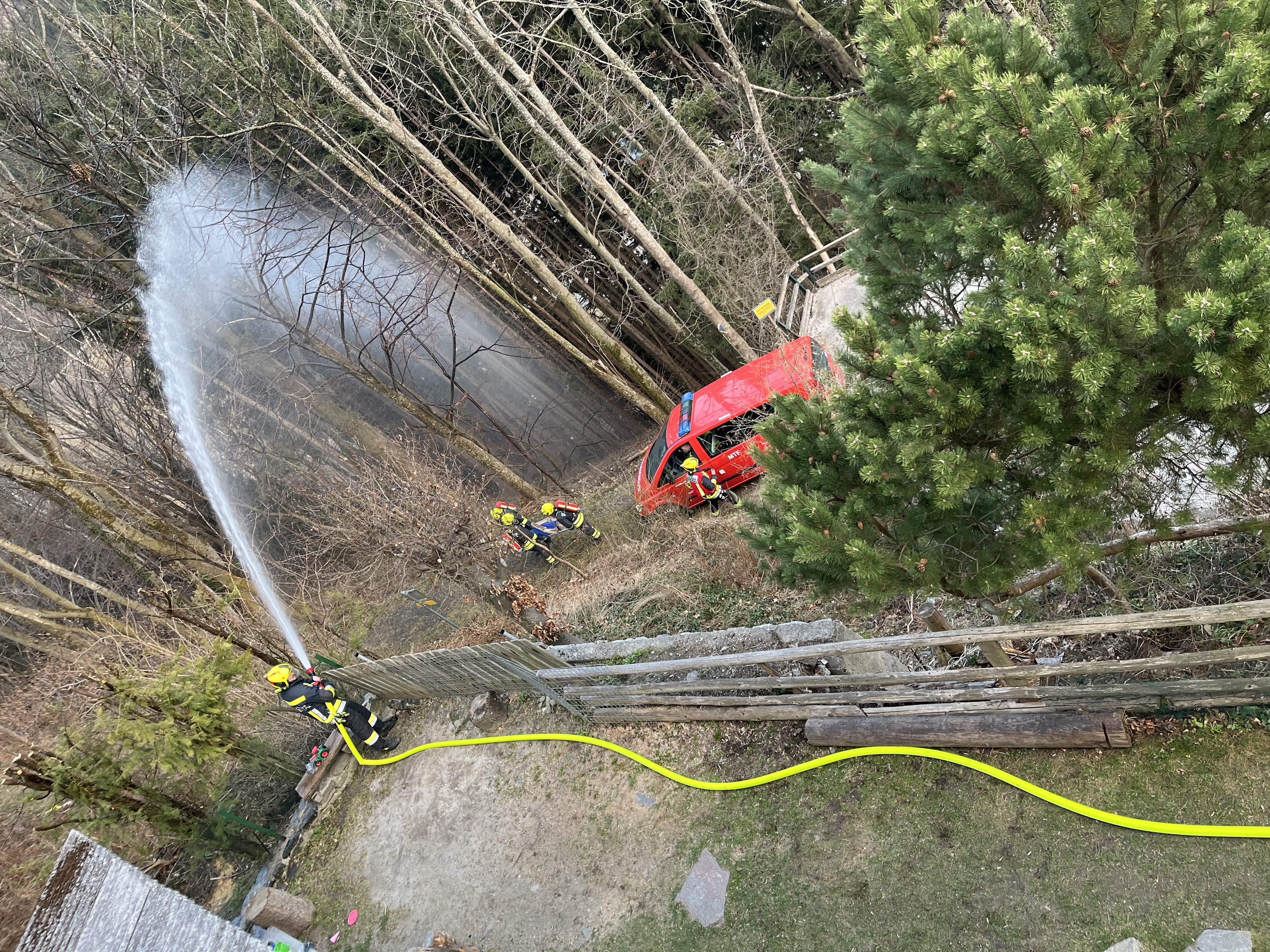 Im Rahmen der Unterabschnittsübung wurde gemeinsam mit den Feuerwehren aus Otterthal und Raach der Brand einer Hütte neben einem Wohnhaus beübt, bei dem mehrere Personen als vermisst galten.