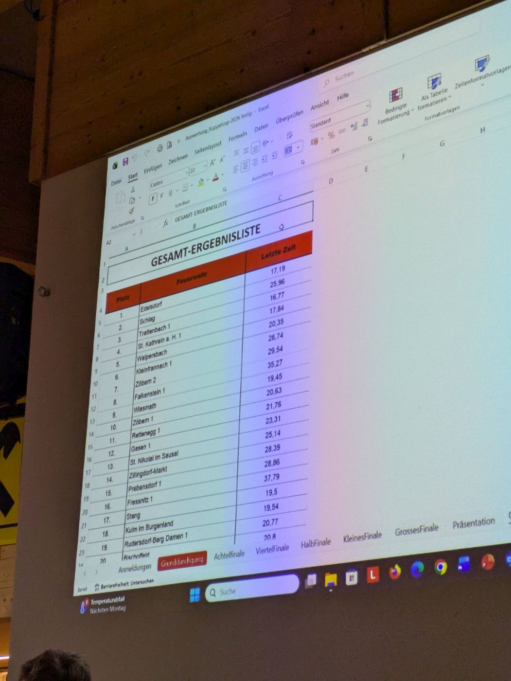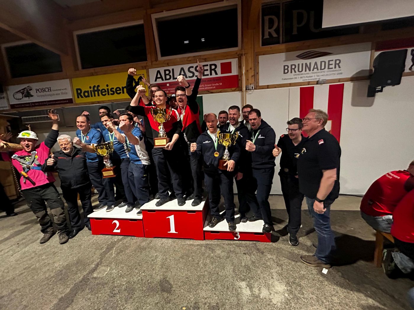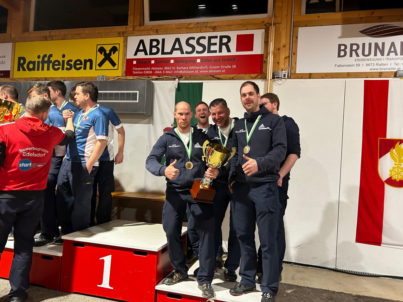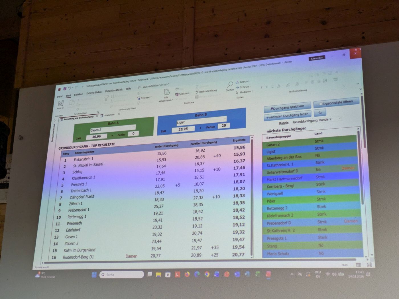 Der Grunddurchgang verlief zunächst durchwachsen: Im ersten Lauf passierten noch Fehler (22,05 + 5), im zweiten Durchgang konnten wir uns mit 18,07 bereits steigern. Wie erwartet lagen die Favoriten Falkenstein, St. Nikolai im Sausal, Schlag und Kleinfrannach vorne.